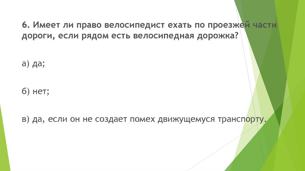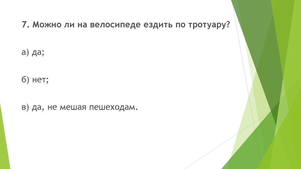 7. Можно ли на велосипеде ездить по тротуару?а) да;