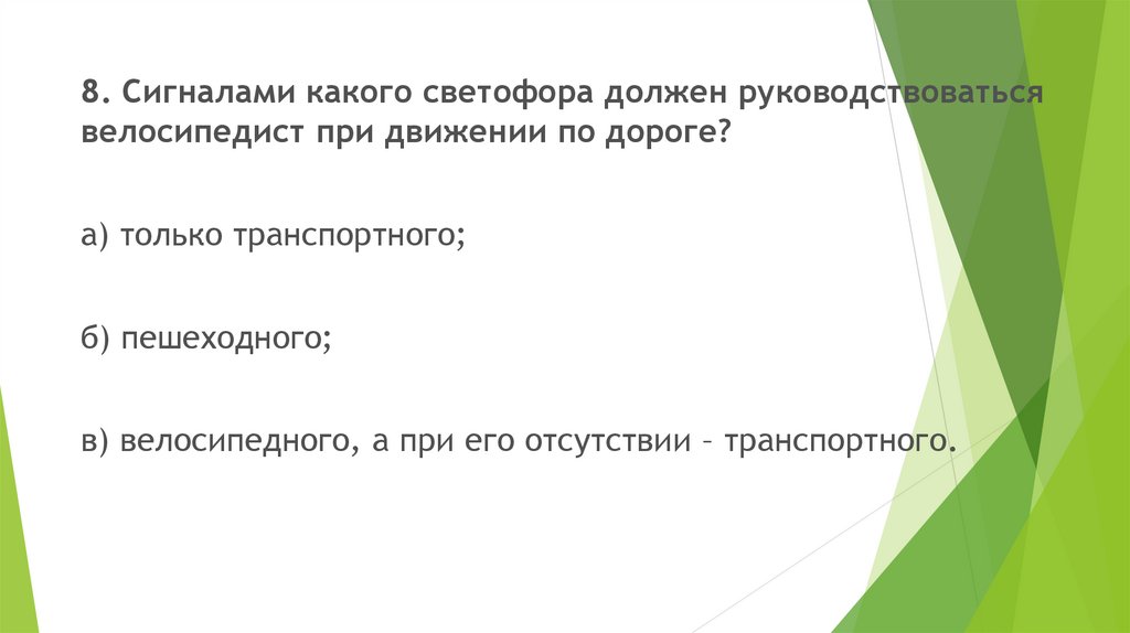 в) нет. Велосипедисты должны подчиняться транспортному