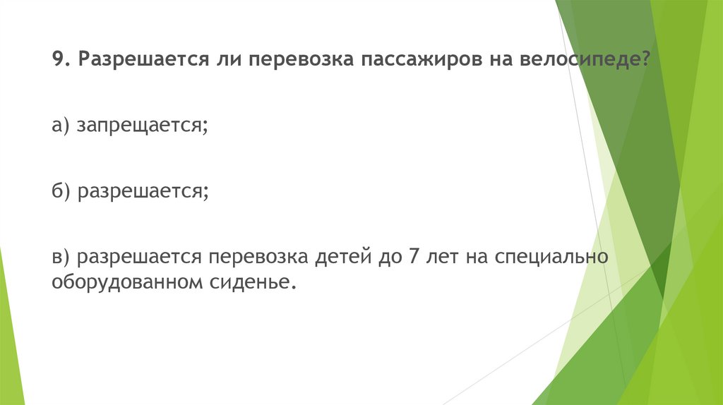 9. Разрешается ли перевозка пассажиров на велосипеде?а) запрещается;