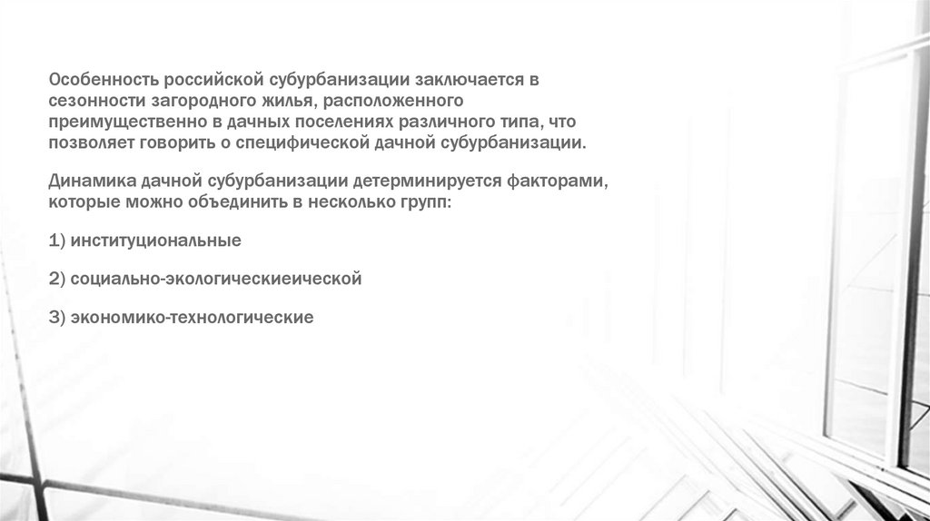 Особенность российской субурбанизации заключается всезонности загородного жилья, расположенного