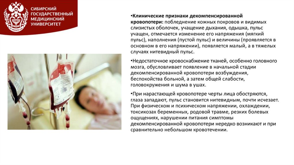 •Клинические признаки декомпенсированнойкровопотери: побледнение кожных покровов и видимых