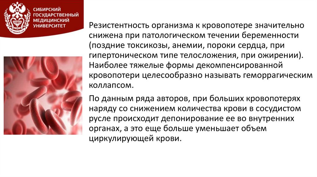 Резистентность организма к кровопотере значительноснижена при патологическом течении беременности