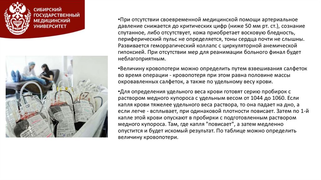 •Величину кровопотери можно определить путем взвешивания салфеток