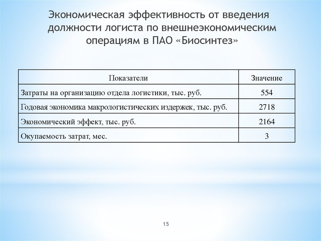Экономическая эффективность от введениядолжности логиста по внешнеэкономическим