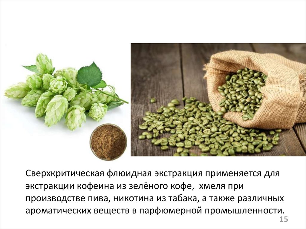 Сверхкритическая флюидная экстракция применяется дляэкстракции кофеина из зелёного кофе, хмеля при