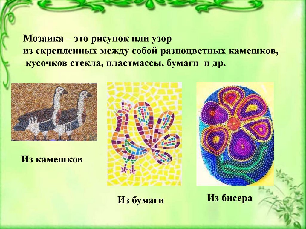 Мозаика – это рисунок или узориз скрепленных между собой разноцветных камешков,