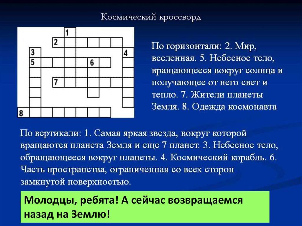 Молодцы, ребята! А сейчас возвращаемсяназад на Землю!