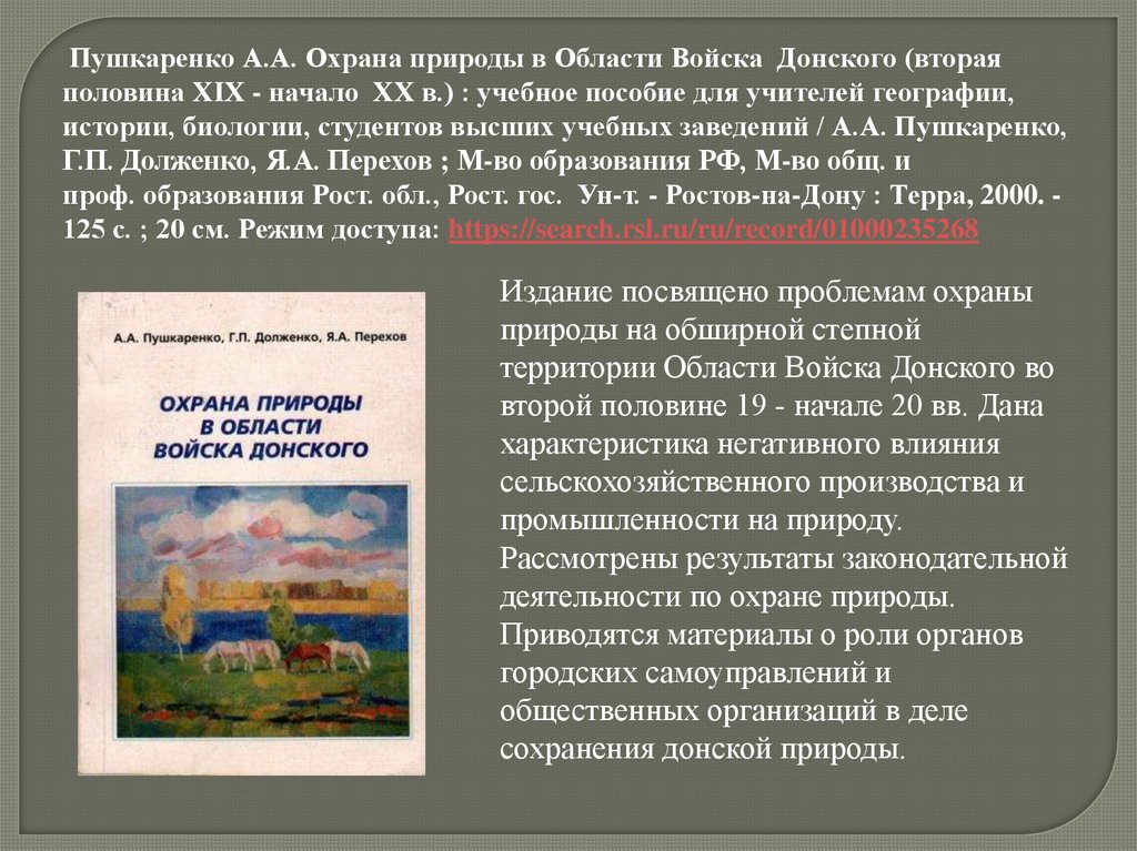 Пушкаренко А.А. Охрана природы в Области Войска Донского (втораяполовина XIX - начало ХХ в.) : учебное пособие для учителей географии,