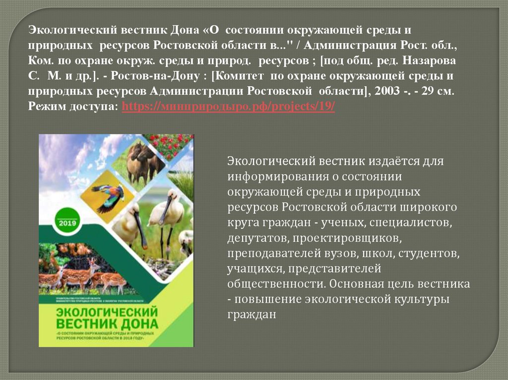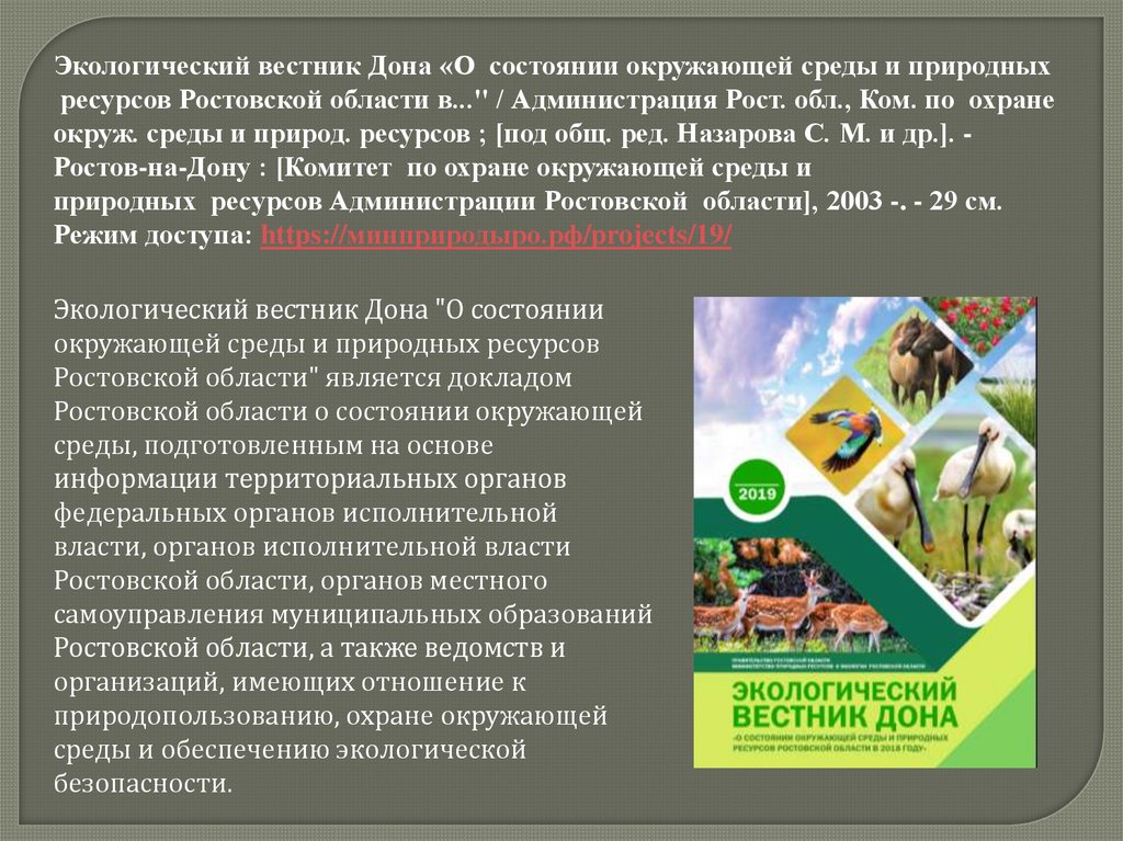 Экологический вестник Дона «О состоянии окружающей среды иприродных ресурсов Ростовской области в..." / Администрация Рост. обл.,