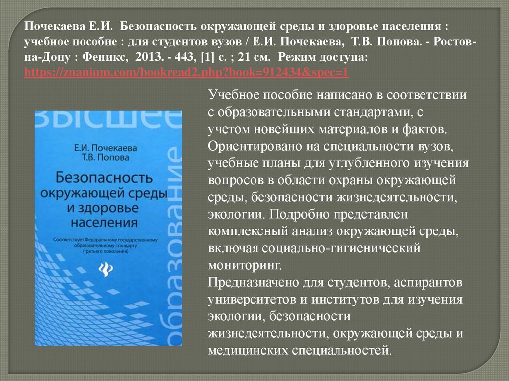 Почекаева Е.И. Безопасность окружающей среды и здоровье населения :учебное пособие : для студентов вузов / Е.И. Почекаева, Т.В. Попова. - Ростовна-Дону : Феникс, 2013. - 443, [1] с. ; 21 см. Режим доступа:
