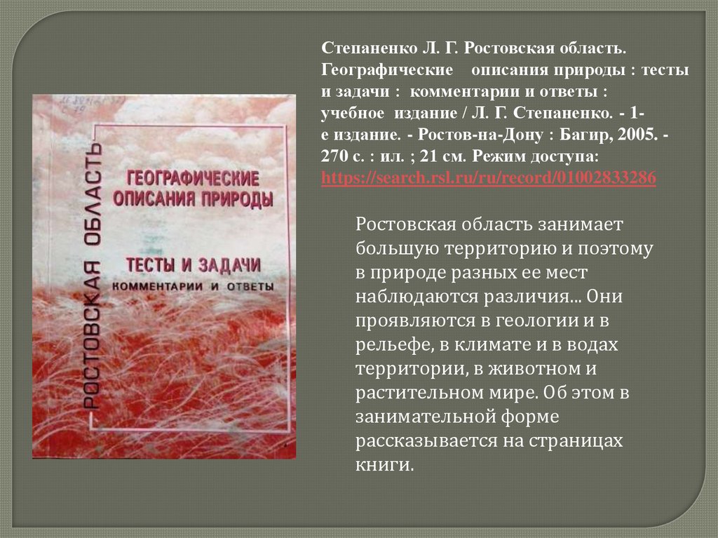 Степаненко Л. Г. Ростовская область.Географические описания природы : тесты