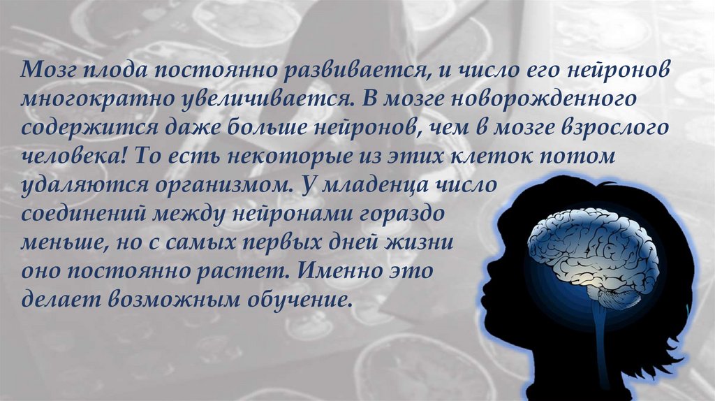 Мозг плода постоянно развивается, и число его нейроновмногократно увеличивается. В мозге новорожденного