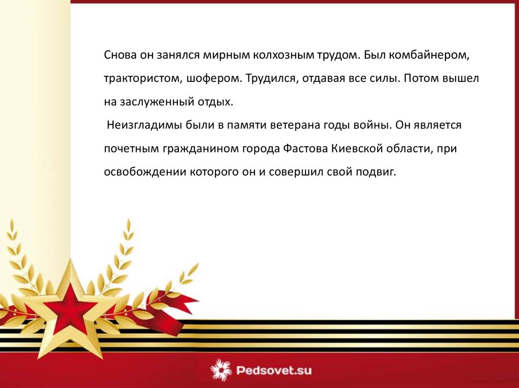 Снова он занялся мирным колхозным трудом. Был комбайнером,трактористом, шофером. Трудился, отдавая все силы. Потом вышел