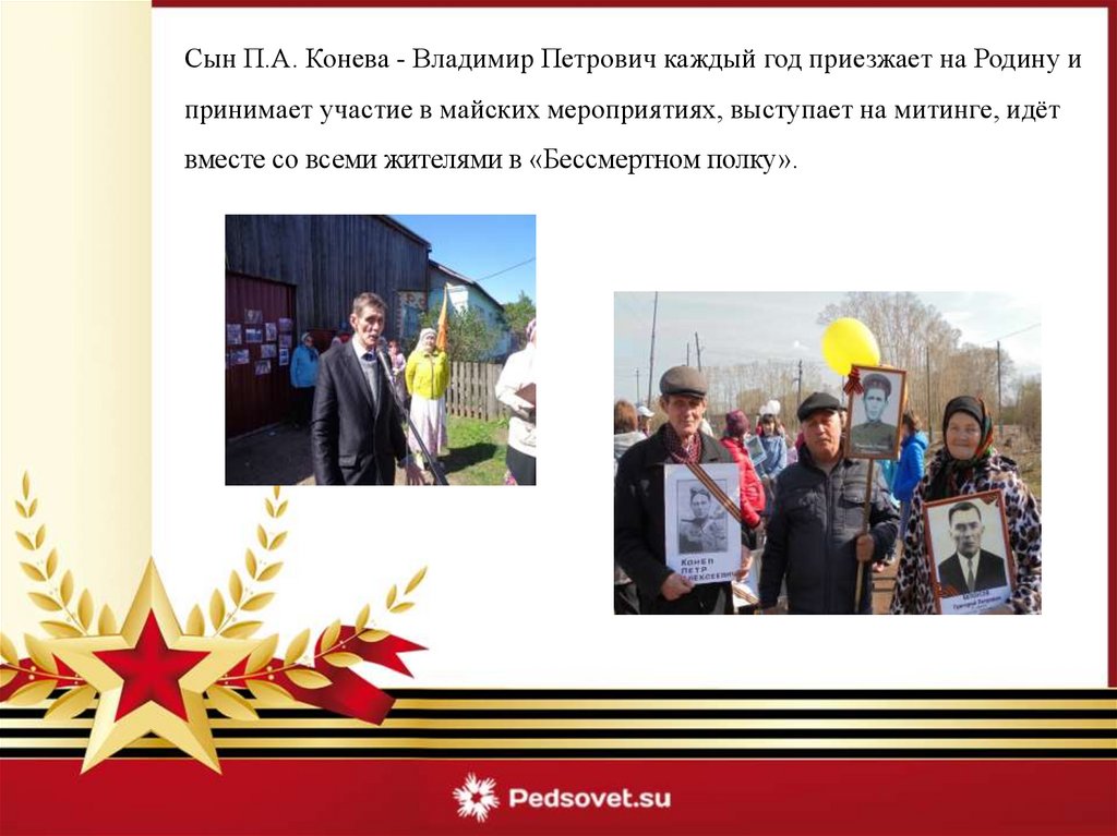Сын П.А. Конева - Владимир Петрович каждый год приезжает на Родину ипринимает участие в майских мероприятиях, выступает на митинге, идёт