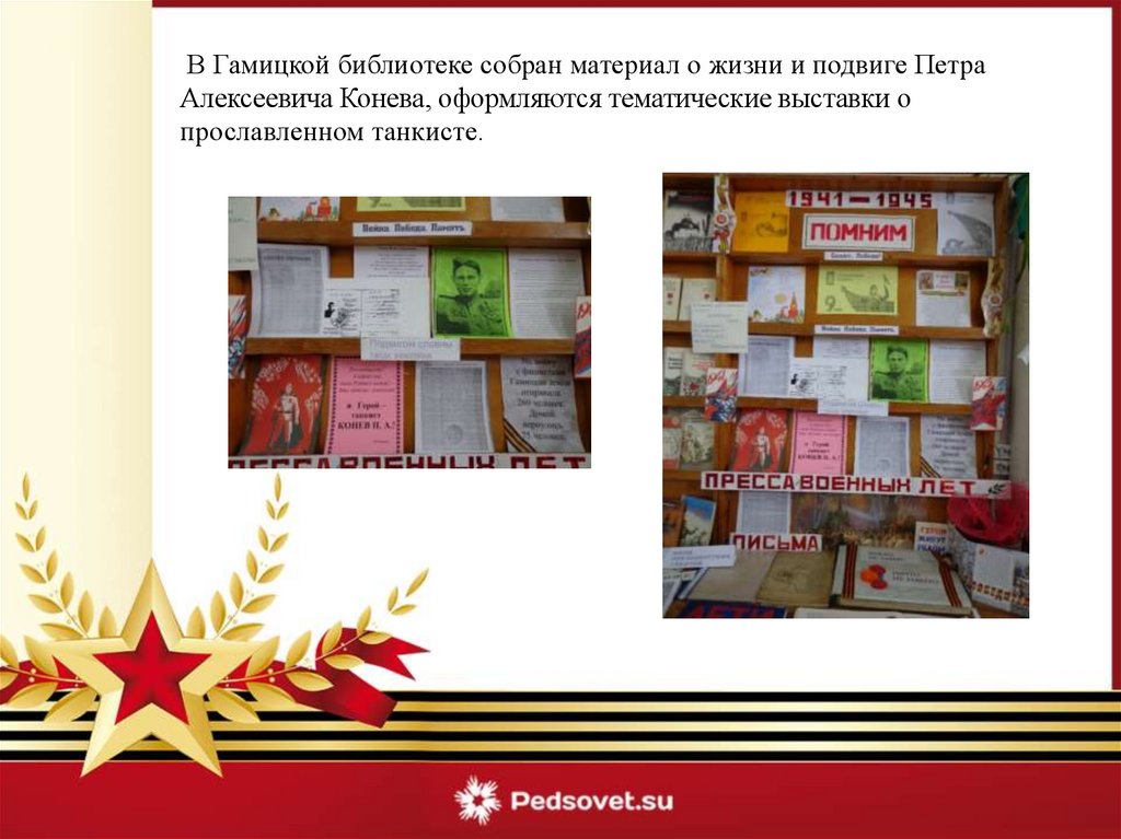 В Гамицкой библиотеке собран материал о жизни и подвиге ПетраАлексеевича Конева, оформляются тематические выставки о