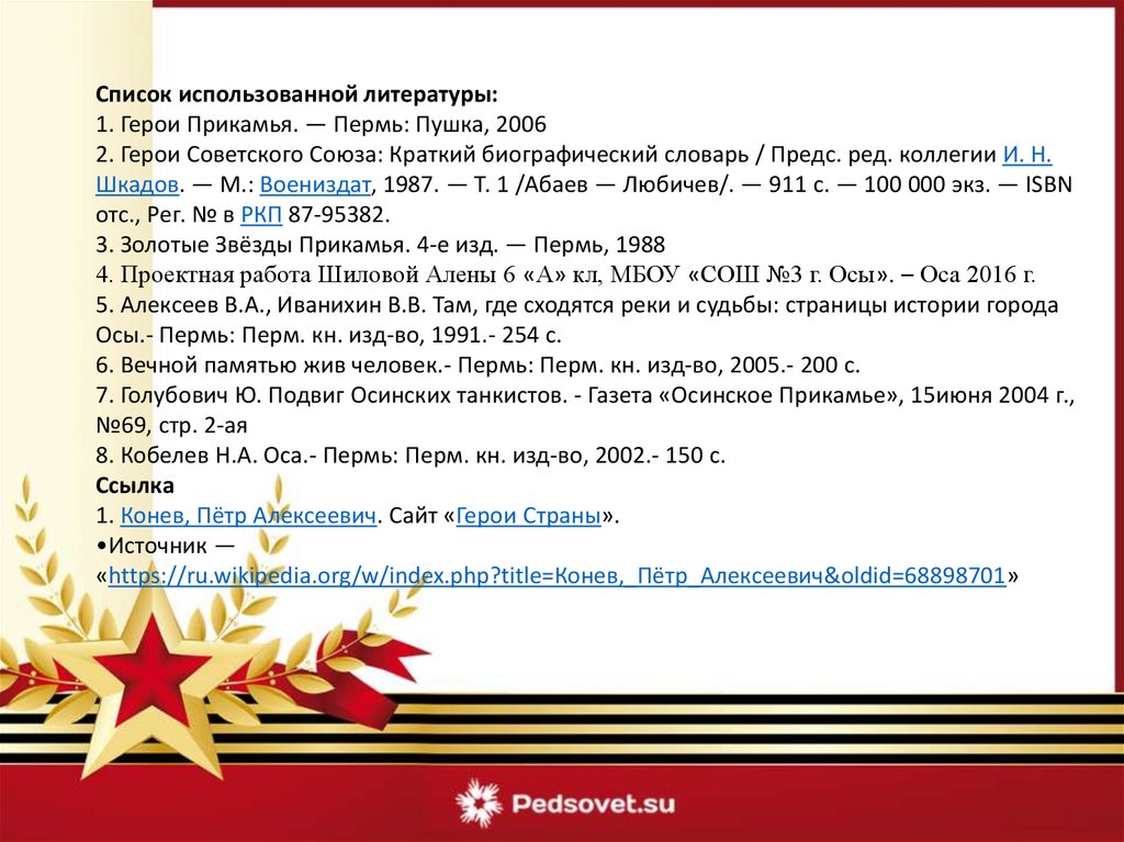 Список использованной литературы:1. Герои Прикамья. — Пермь: Пушка, 2006