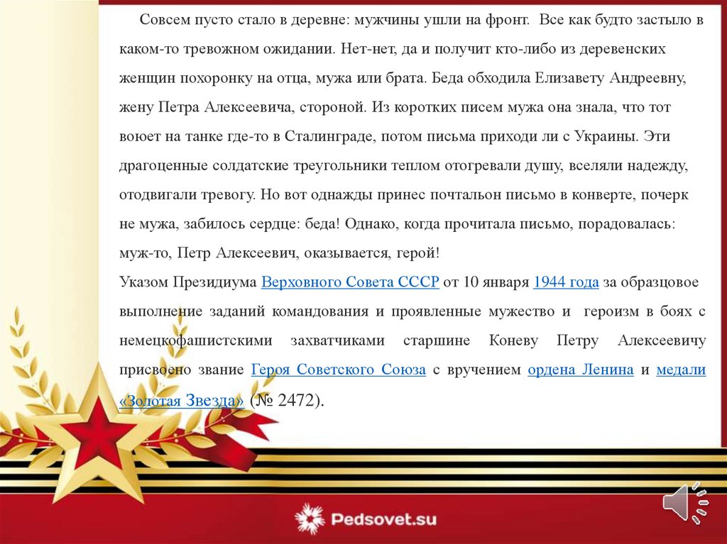 Совсем пусто стало в деревне: мужчины ушли на фронт. Все как будто застыло вкаком-то тревожном ожидании. Нет-нет, да и получит кто-либо из деревенских