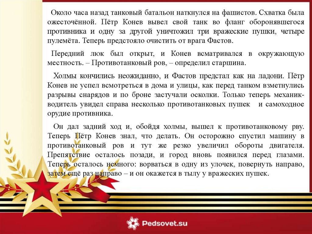 Около часа назад танковый батальон наткнулся на фашистов. Схватка былаожесточённой. Пётр Конев вывел свой танк во фланг оборонявшегося