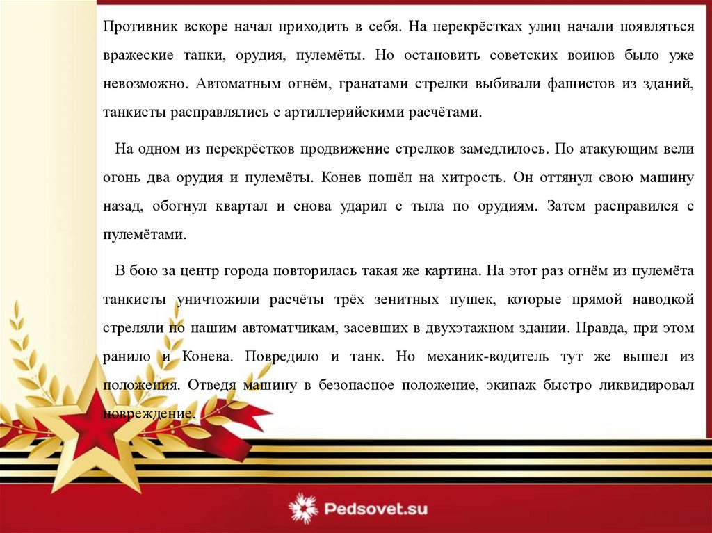 Противник вскоре начал приходить в себя. На перекрёстках улиц начали появлятьсявражеские танки, орудия, пулемёты. Но остановить советских воинов было уже
