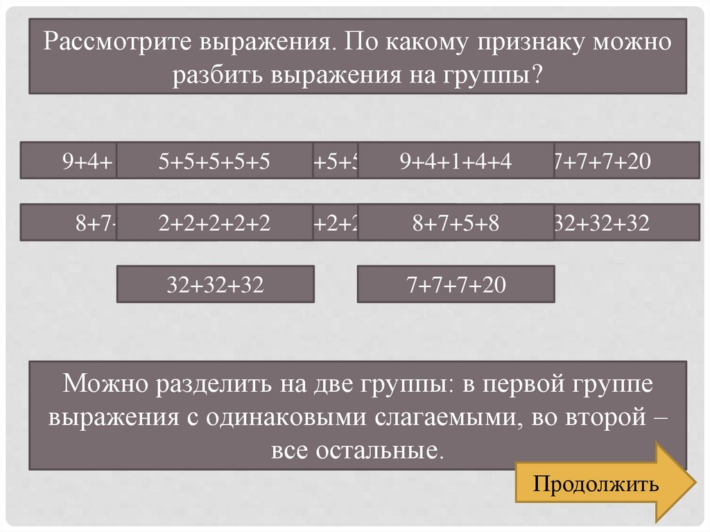Рассмотрите выражения. По какому признаку можноразбить выражения на группы?