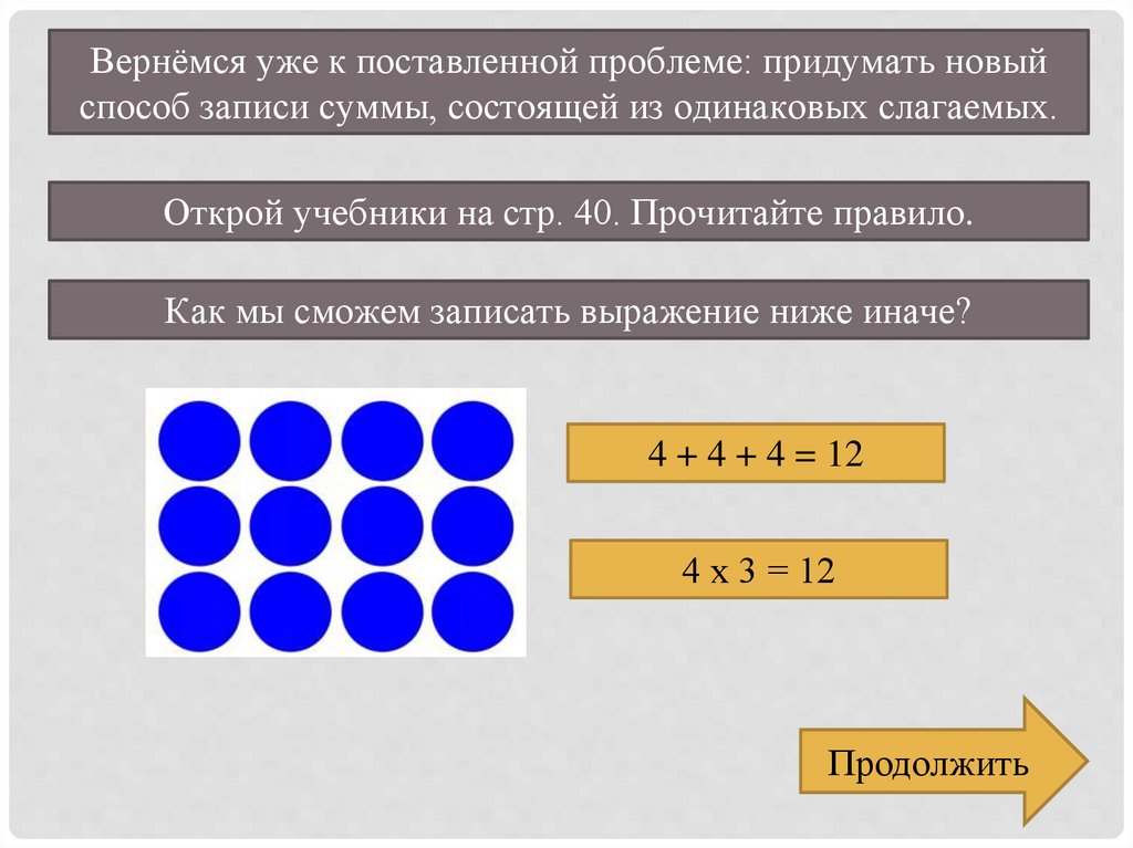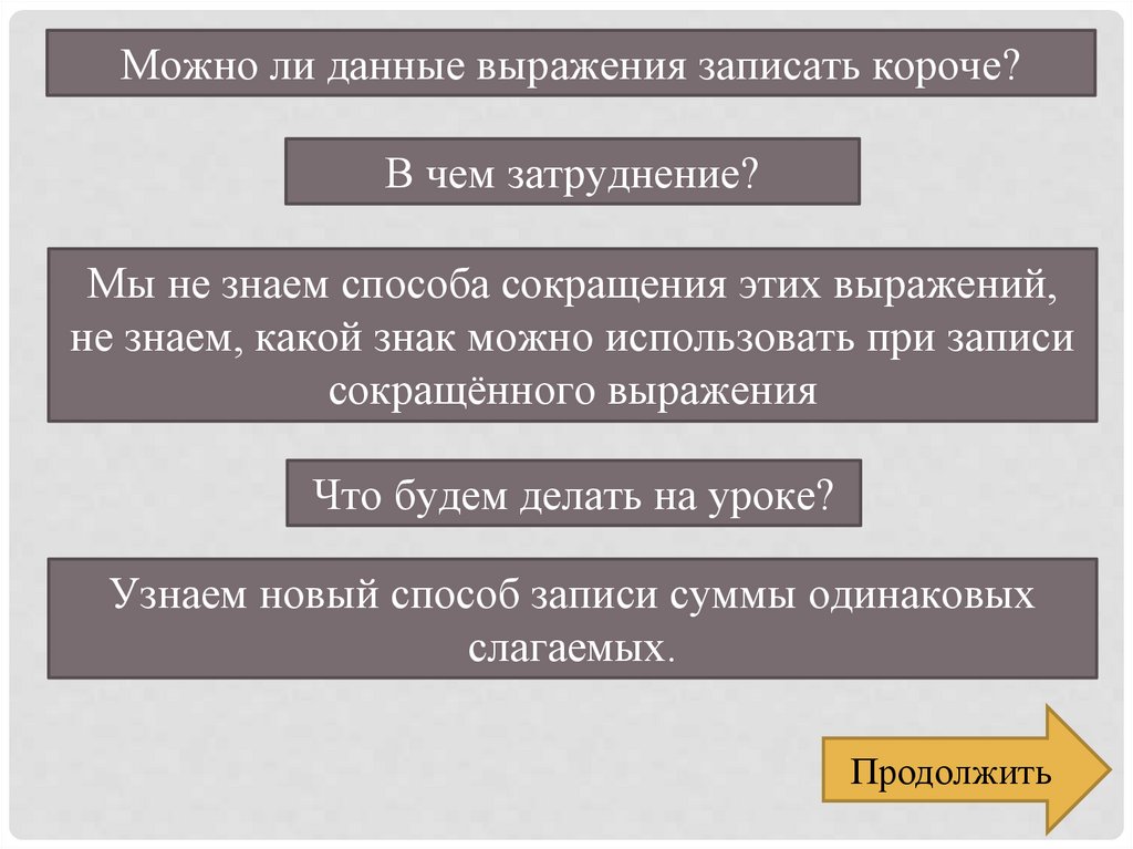 Вернёмся уже к поставленной проблеме: придумать новыйспособ записи суммы, состоящей из одинаковых слагаемых.
