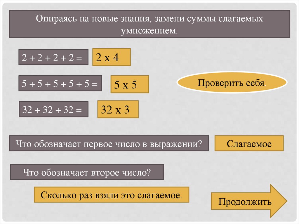 Опираясь на новые знания, замени суммы слагаемыхумножением.