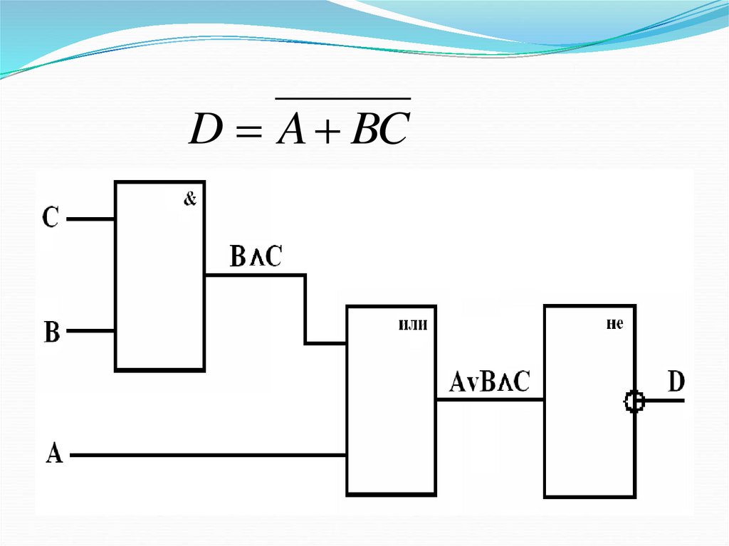 18. Синтезуємо у базисі І,АБО,НЕ схему для логічного виразу: