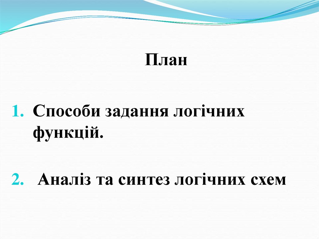 6. Способи задання логічних функцій Логічні елементи виконують логічні операції, внаслідок чого вхідна інформація перетворюється