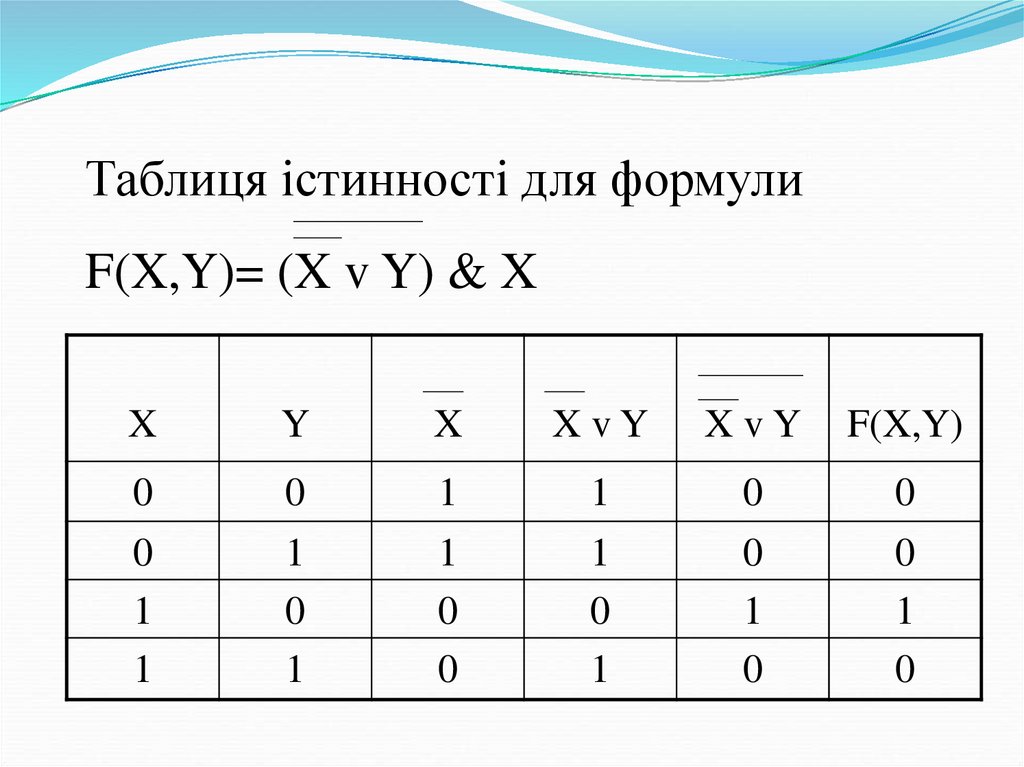 Таблиця істинності для формулиF(X,Y)= (X v Y) & X
