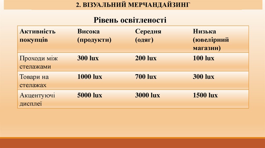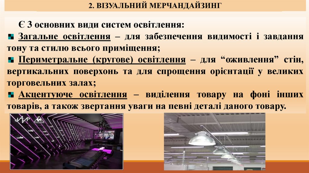 3. Особливості освітлення торгової зали різних типів магазину.