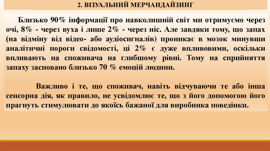 музикальні рішення, аромамаркетинг тощо, що здатні формувати