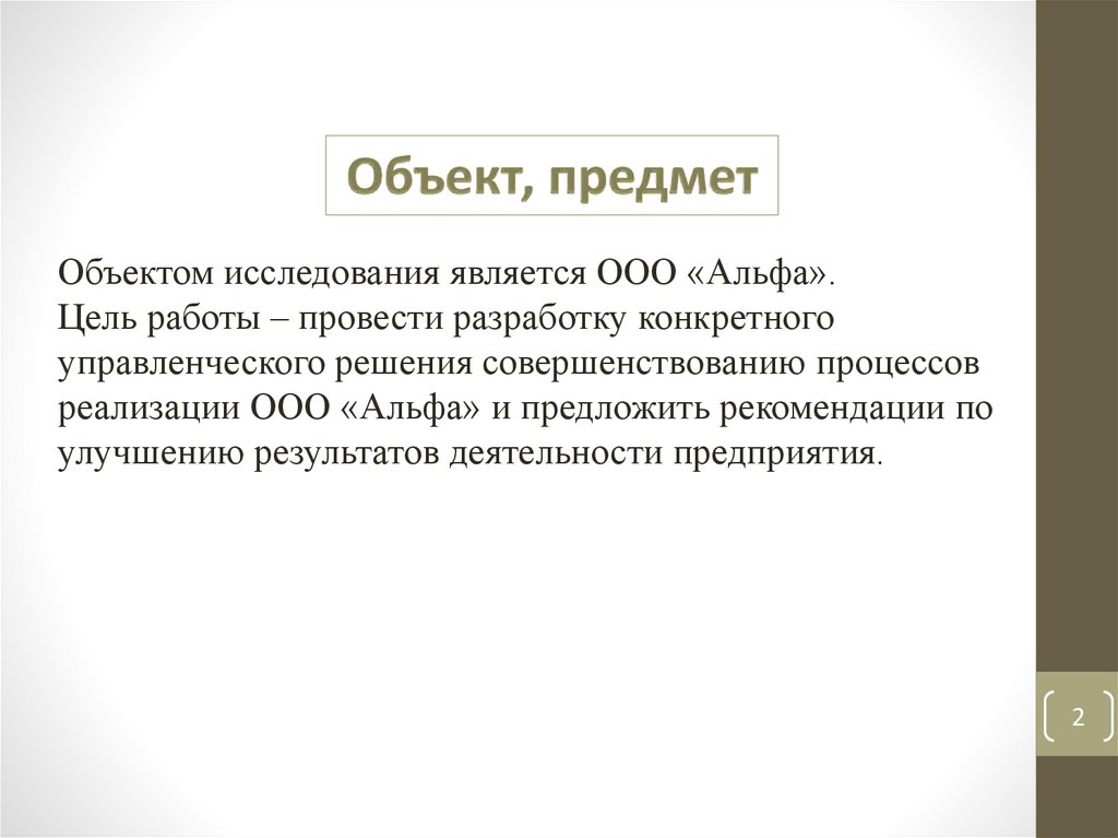 Объектом исследования является ООО «Альфа».Цель работы – провести разработку конкретного