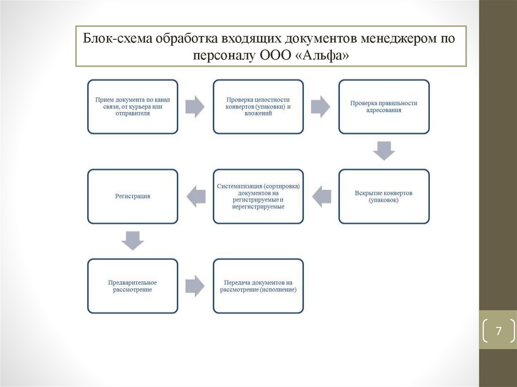 Блок-схема обработка входящих документов менеджером поперсоналу ООО «Альфа»