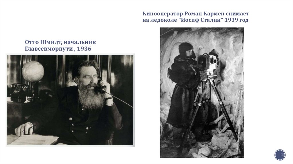 Кинооператор Роман Кармен снимаетна ледоколе "Иосиф Сталин" 1939 год