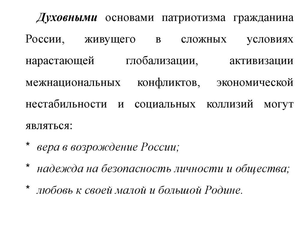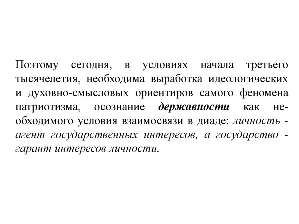 патриотизма, осознание державности как необходимого условия взаимосвязи в диаде: личность агент государственных интересов, а государство гарант интересов личности.