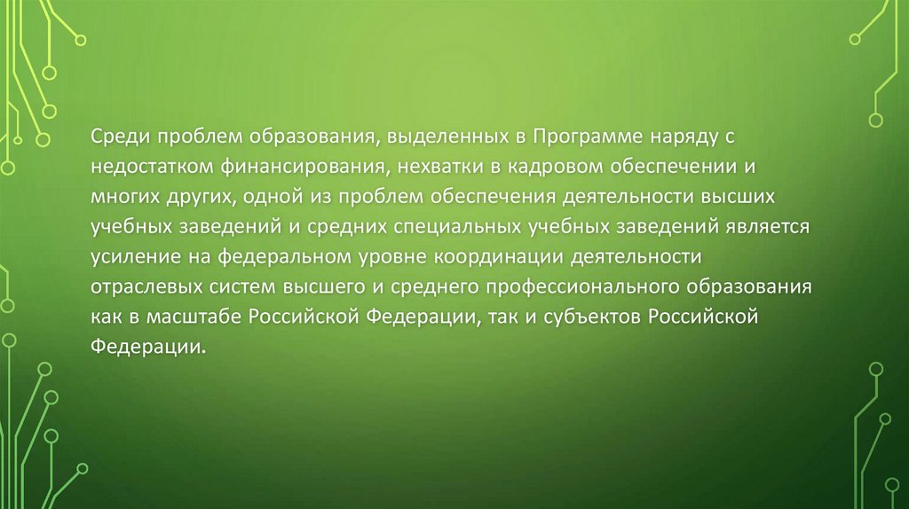 Среди проблем образования, выделенных в Программе наряду снедостатком финансирования, нехватки в кадровом обеспечении и