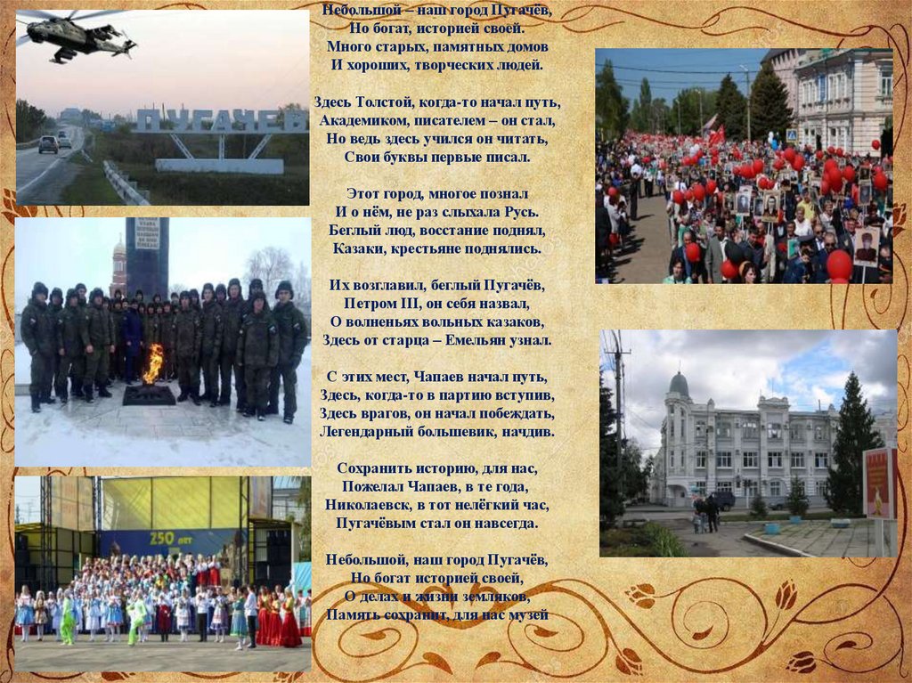 Небольшой – наш город Пугачёв,Но богат, историей своей.