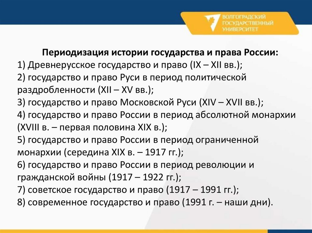 Периодизация истории государства и права России:1) Древнерусское государство и право (IX – XII вв.);