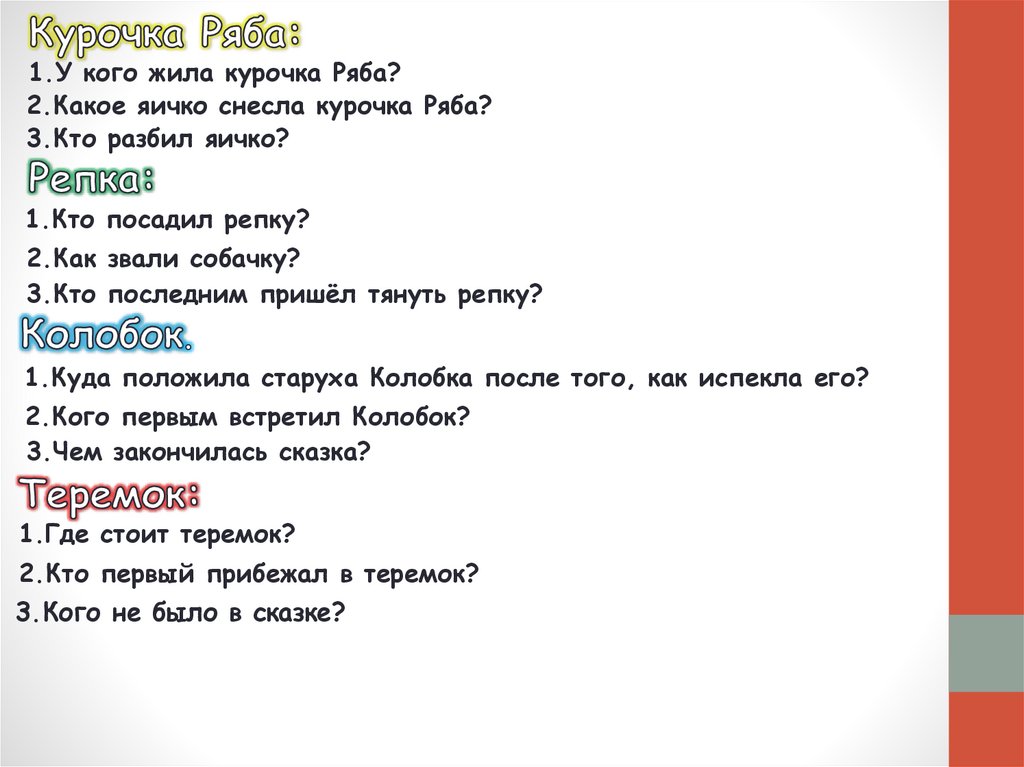 1.У кого жила курочка Ряба?2.Какое яичко снесла курочка Ряба?