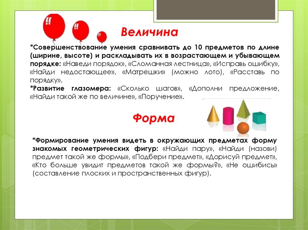 «Кто больше увидит предметов такой же формы?», «Не ошибись»