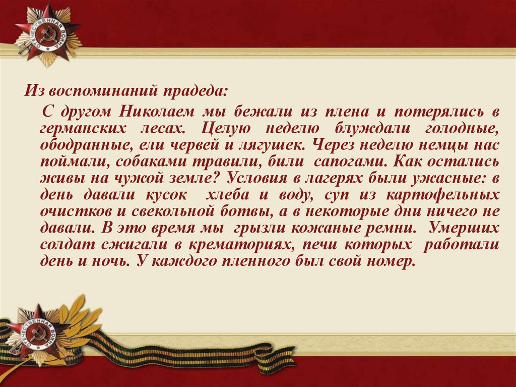 Из воспоминаний прадеда:С другом Николаем мы бежали из плена и потерялись в