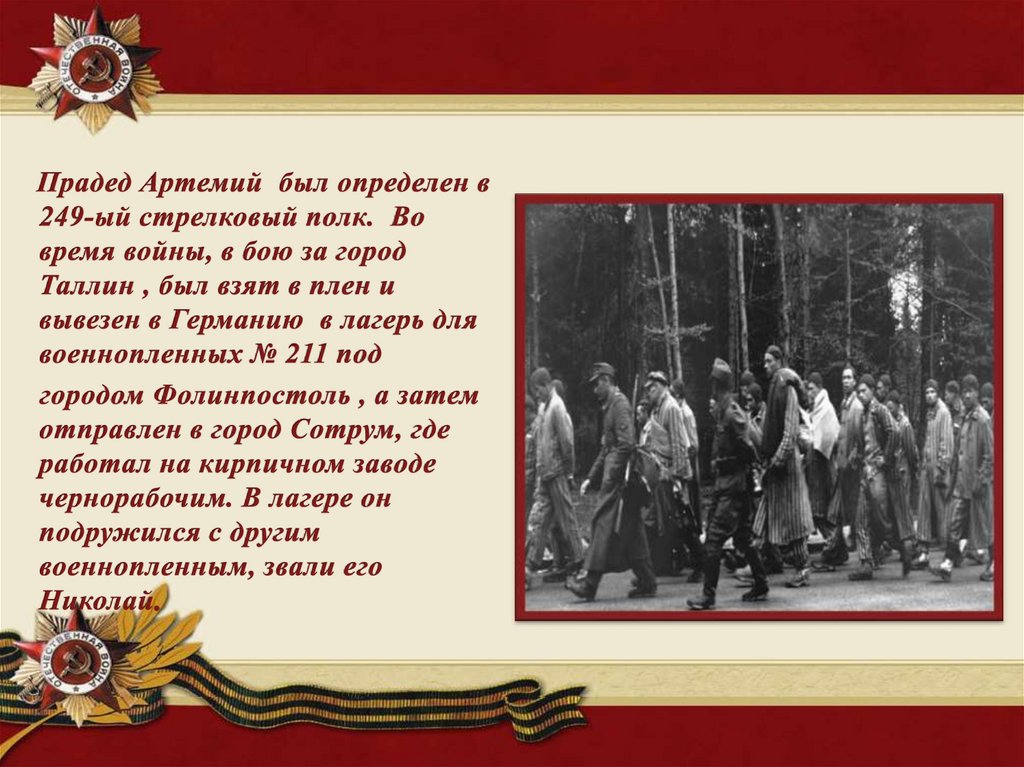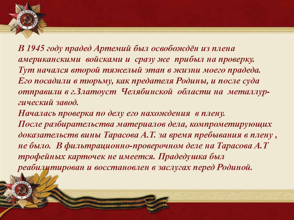 В 1945 году прадед Артемий был освобождён из пленаамериканскими войсками и сразу же прибыл на проверку.