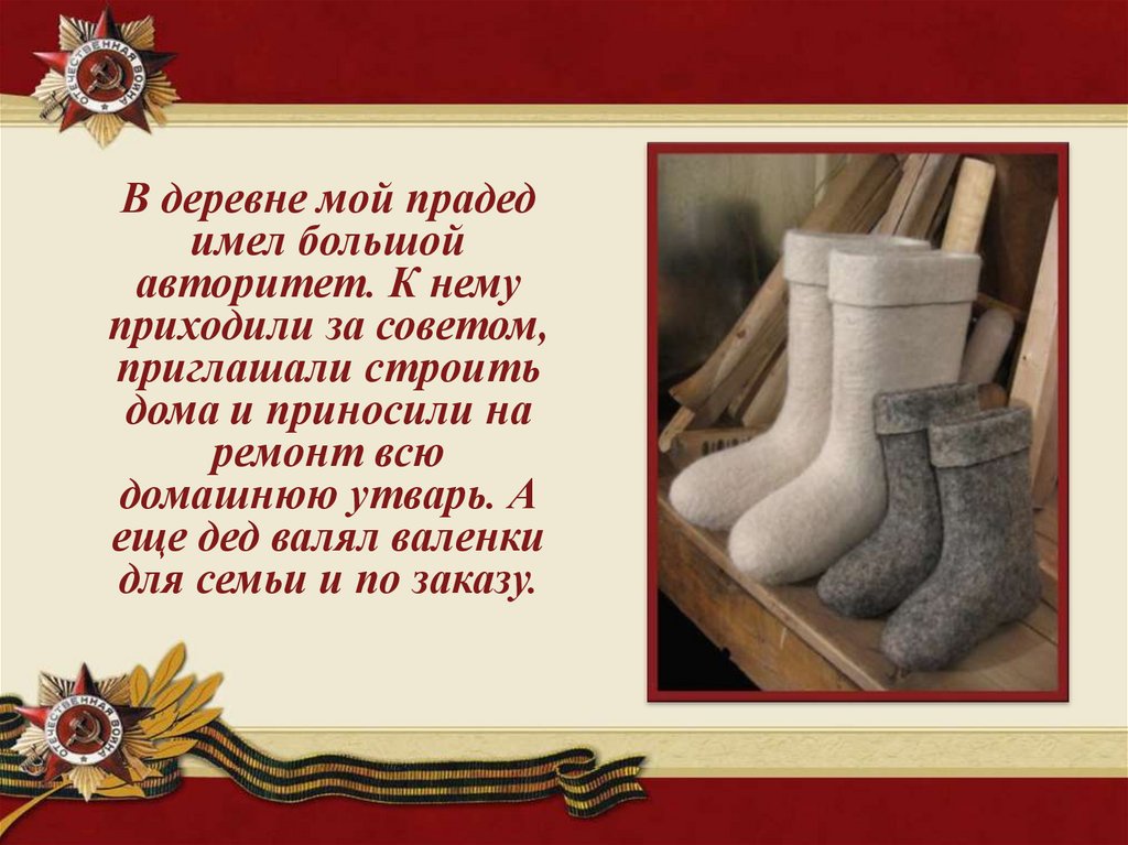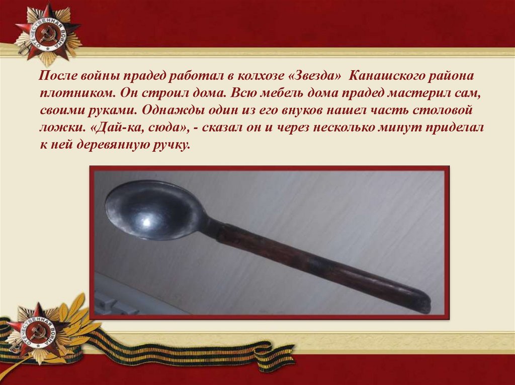 После войны прадед работал в колхозе «Звезда» Канашского районаплотником. Он строил дома. Всю мебель дома прадед мастерил сам,