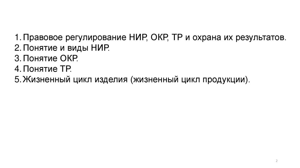 1. Правовое регулирование НИР, ОКР, ТР и охрана их результатов.2. Понятие и виды НИР.