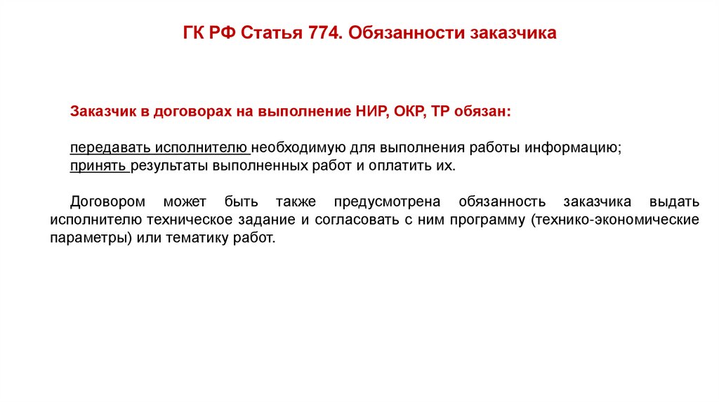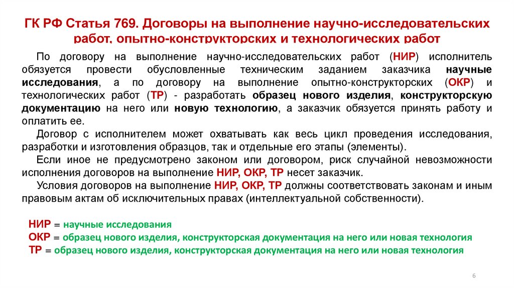 Статья 769. Договоры на выполнение научно-исследовательских работ, опытноконструкторских и технологических работ