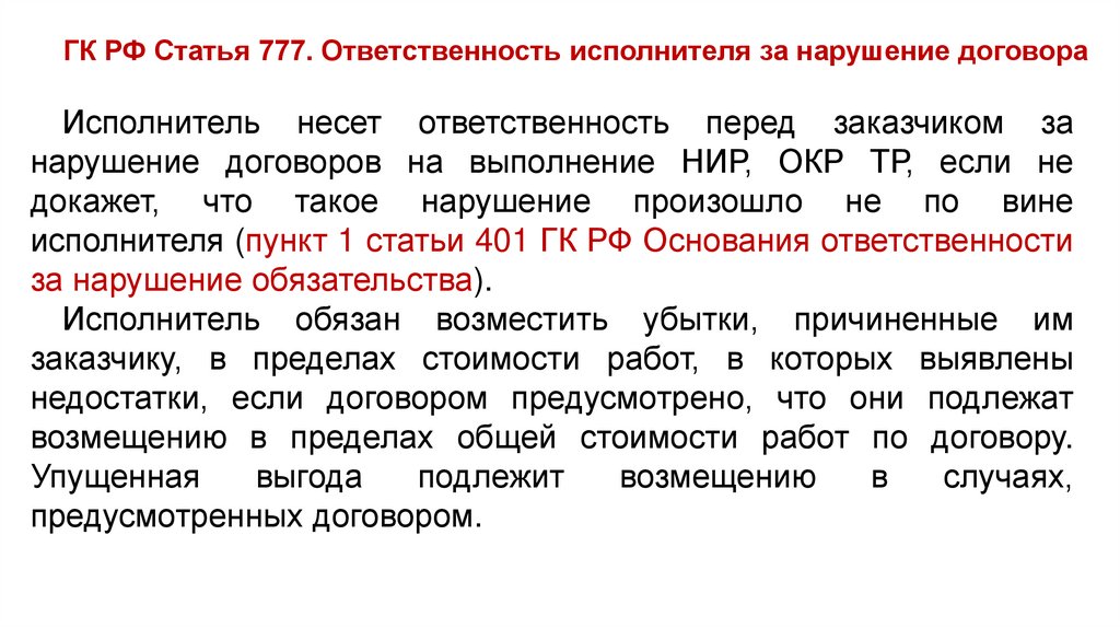 Статья 777. Ответственность исполнителя за нарушение договора