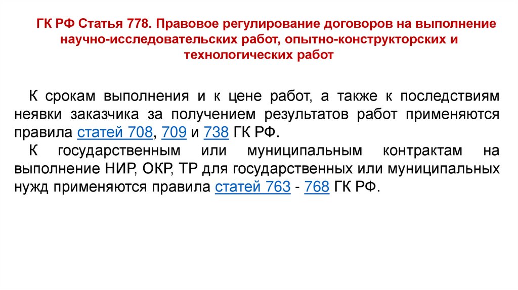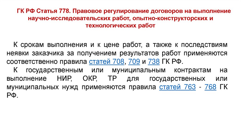 Статья 778. Правовое регулирование договоров на выполнение научноисследовательских работ, опытно-конструкторских и технологических работ
