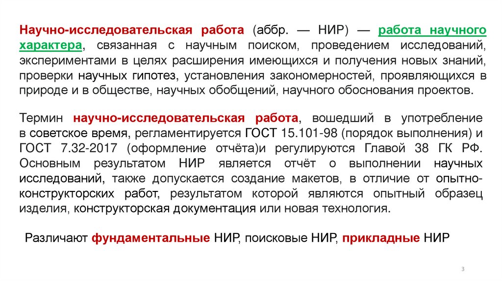 Различают фундаментальные НИР, поисковые НИР, прикладные НИР