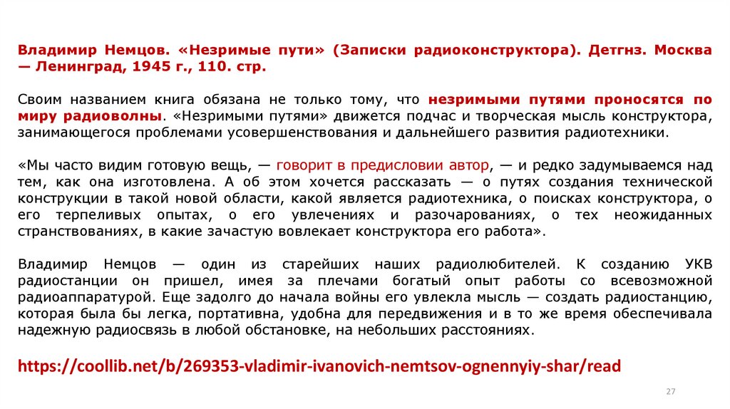 Владимир Немцов. «Незримые пути» (Записки радиоконструктора). Детгнз. Москва— Ленинград, 1945 г., 110. стр.