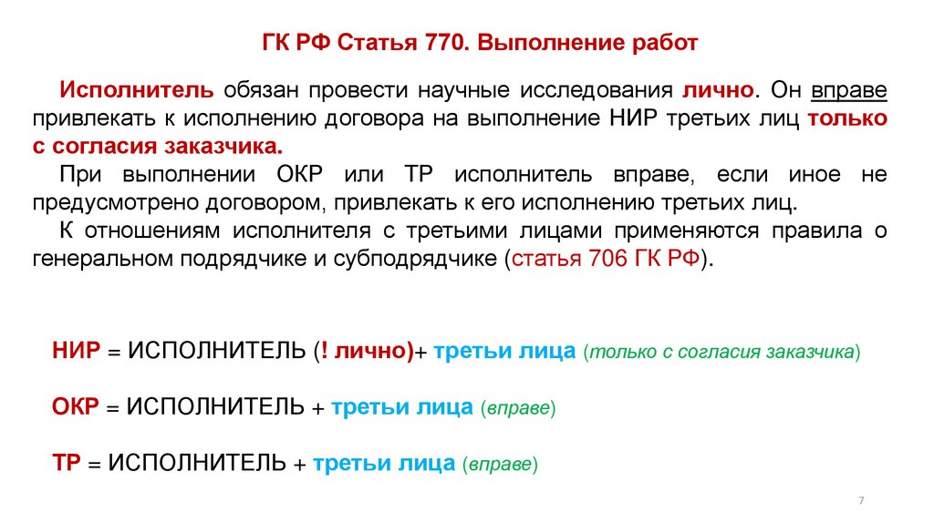 ГК РФ Статья 770. Выполнение работИсполнитель обязан провести научные исследования лично. Он вправе